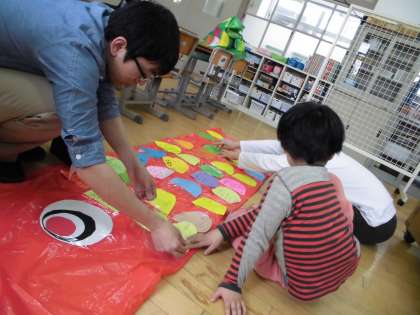こいのぼりにうろこをはるのは、1年1組,2組のみんなと杉の子のみんなで一緒に交流して作りました。楽しみながら仲良くなることができました。