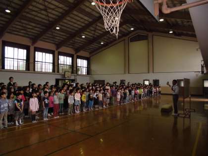 全校児童が体育館に集まり、5月の児童集会がありました。この時初めて、なかよしグループ(たてわりグループ)で集合しました。