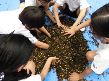 今日は、田植えをしました。まずは土作りです。みんなで協力して「いいお米が育ちますように」と土を混ぜ合わせました。