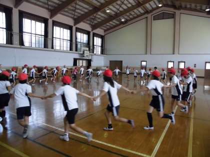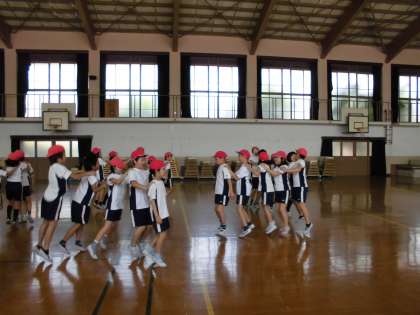 今日も体育館で、キャンプファイヤーの練習をしました。みんなで手をつないで輪になって踊る「マイムマイム」もずいぶん上手に踊れるようになってきました。