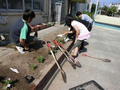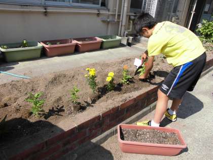 「立派に育つかな?」「きれいに咲いてほしいな」「1週間でずいぶん大きくなったなあ」など、この花々に一番注目するのは、植えた本人である環境委員の子どもたちでしょう。