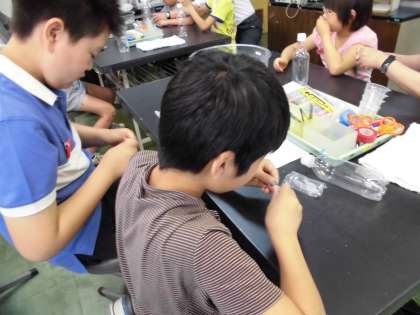 6年生は、ペットボトルで浮沈子を作りました。屋外では空気砲やパイプオルガンにトライしたり、屋内では話す恐竜を見たりしました。また、振り子やパラボラアンテナや磁石などの展示物を体験しました。
