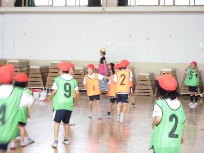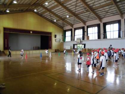 2年生は体育館で、おりかえしリレーとドッヂボールをしました。チーム対抗戦で、どのチームも負けじと精一杯がんばる姿が見られました。