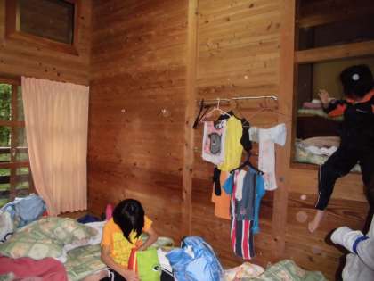 友達と協力してシーツをたたんだり、荷物の整理をしたりしています。
