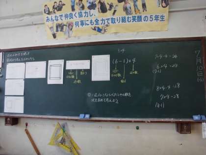 意見交流する中で、6×4−4 と(6−1)×4 の二つの式は、たとえ一辺に○がいくつ並んでも、すぐに答えが求められることに気がつきました。