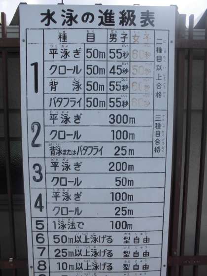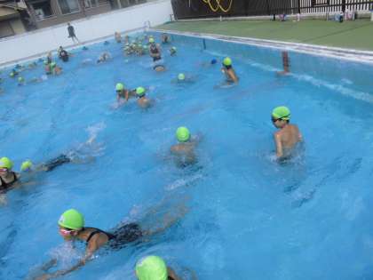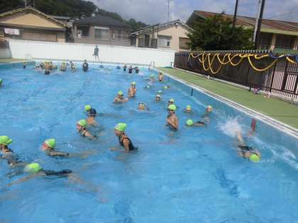 水慣れをした後、何m泳げるか、また、50mを何秒で泳げるか、水泳の検定をしました。