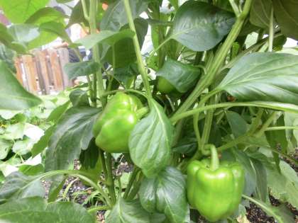 ピーマンはまだ緑色ですが、もうすぐ赤色と黄色になる予定です。
