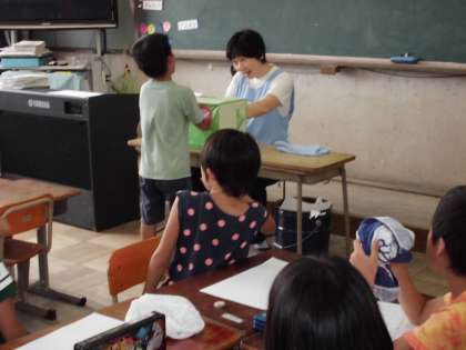 「ハテナボックスの中には何が入っているでしょう?」と聞くと、子どもたちは「何かチクチクする」「ツルツルする」と言って、すぐなすびだと分かりました。ただ、調理して食べるだけではなく、触ったり、切って種に気づいたり、においをかいだり、五感を使って夏野菜のなすびを観察しました。