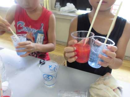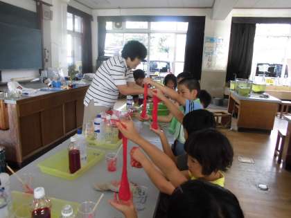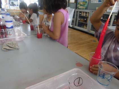 教えてもらったとおりに、一生懸命に取り組む1年生。その甲斐あって、どの子もスライム作りが大成功しました。