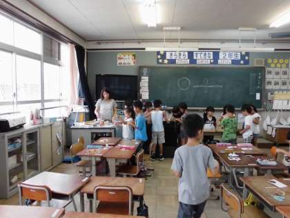 2年生は、夏休みの楽しかったことを話した後、びゅんびゅんごまを作りました。