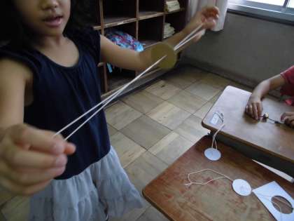 厚紙を2枚重ねたり、段ボールを使ったり、試行錯誤を繰り返し、ようやく「びゅん!びゅーん!!」とよく回るびゅんびゅんごまが完成しました。