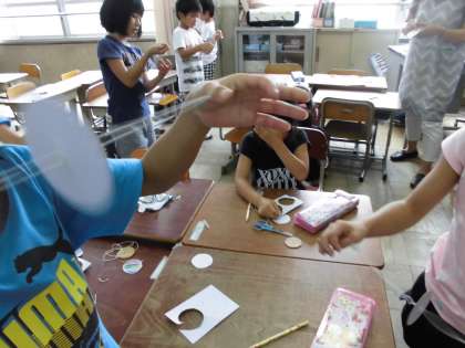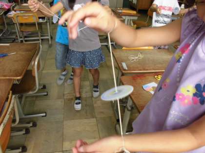 回すこつをつかんだ子が、なかなか回せない子に親切に教えてくれています。中には左右に手を広げるのではなく、上下に手を広げて回す子もいます。