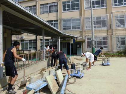 暑い中、みんな汗をかきかき奮闘しています。特に運動場の溝にたまった土をさらうのは重労働です。
