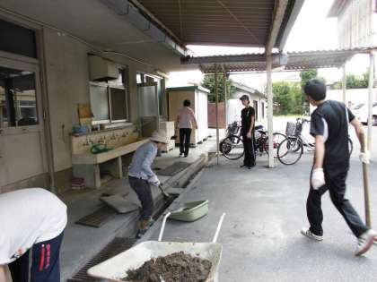 給食室前の溝も土を取り去って、排水がよくなるようにしています。