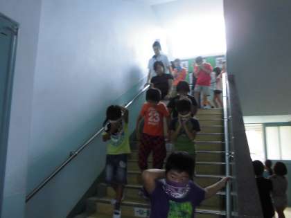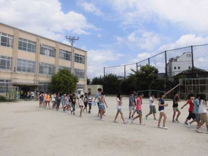 「訓練、火事! 家庭科調理室から火災が発生しました。児童の皆さんは・・・・・」の放送後すぐ、子どもたちは担任の先生の話を静かに聞き、短時間で運動場に避難できました。