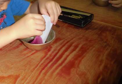 次に、和紙を折って、うまく模様がつくように色水につけます。