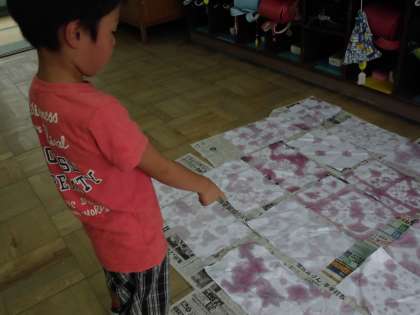 染まった和紙を牛乳パックにはって、鉛筆立てを作る予定です。