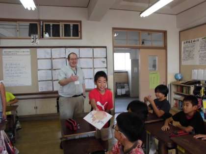 教室で一緒に給食を食べたり、運動場で遊んだりするとてもフレンドリーな先生です。