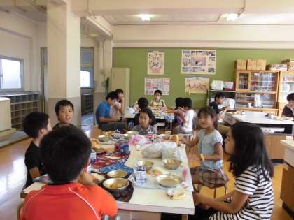 まだ慣れずに静かに食べているグループもあれば、「今日のなかよし遊び、楽しかったね!」など、会話の弾んでいるグループもあります。