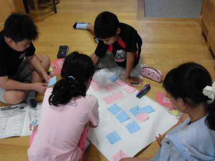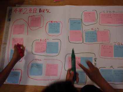 エコのためにがんばれたことを青い付箋に書き、がんばれなかったことを赤い付箋に書いて、夏休みの「エコライフ」を振り返りました。