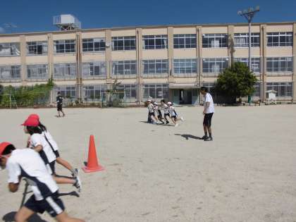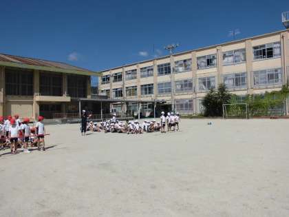 3年生は、4年生と一緒に運動場で運動会の練習をしました。団体競技「台風の目」の練習です。