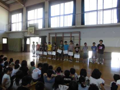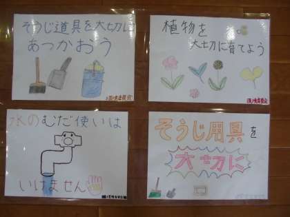 「水のむだ使いはやめましょう」と全校児童に呼びかけました。