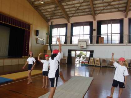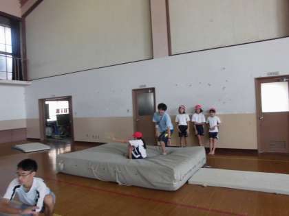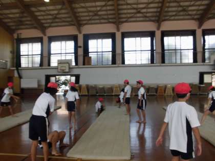 1校時、5年生は体育館でマット運動をしました。