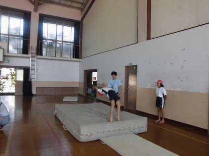 マットの下に長いすを入れてスロープを作ったり、ゴムひもを使って足が高く上がるようにしたり、様々な工夫をしながら練習しています。