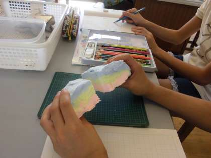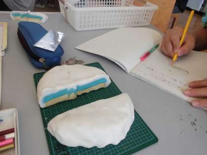 色の異なる粘土を重ね合わせて、それを切断して、断面を観察しました。