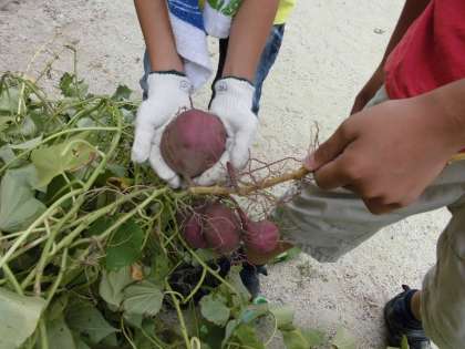 「いもづる式」という言葉がありますが、まさしくその言葉通り、つるを引っ張ると面白いようにさつまいもが土の中から出てきて、子どもたちは大喜びです。