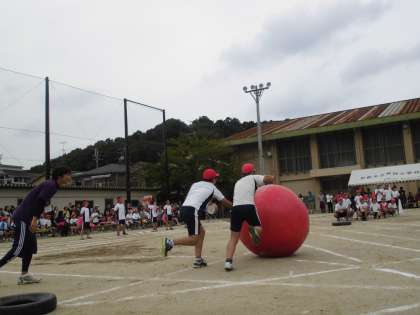たてわり種目の大玉転がしです。