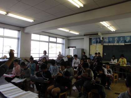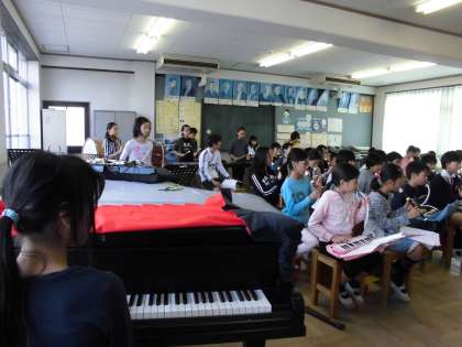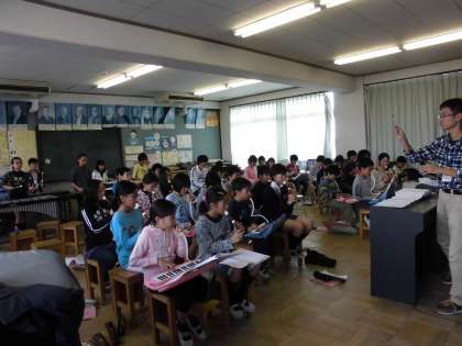 パート練習でそれぞれが演奏できるようになった後、音楽室で全体練習をしました。