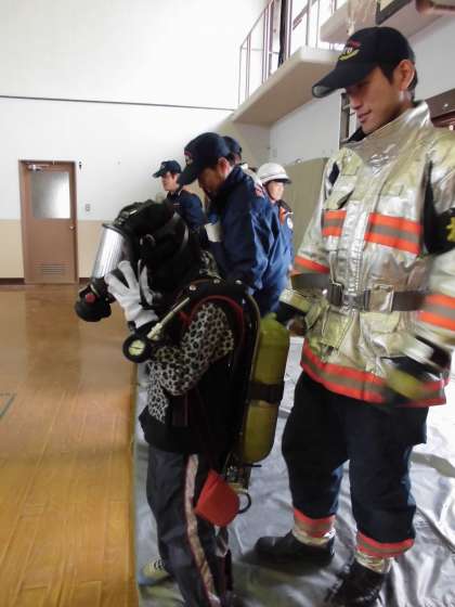 子どもたちは「このボンベ、すごく重い!」「これで息をして人を助けるのか!」と口々に言いながら、ボンベを担いでマスクをしました。
