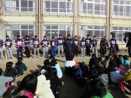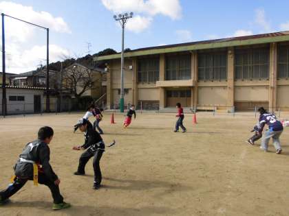 スポーツして遊ぼう会では、佛教大学アメリカンフットボール部ホークスのメンバーに、「タグフットボール」を教えていただきました。