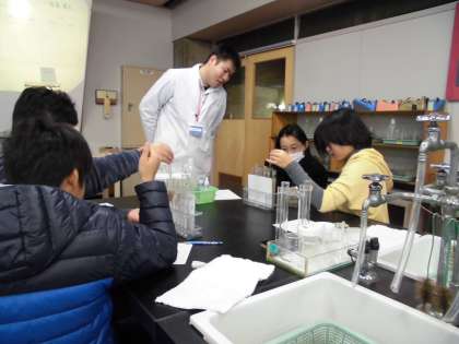 「水の汚れと自然」では,水が汚れをきれいにする浄化作用について学習しました。いろいろな液体に,薬品を投入し,色が変わる様子を観察することができました。