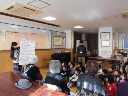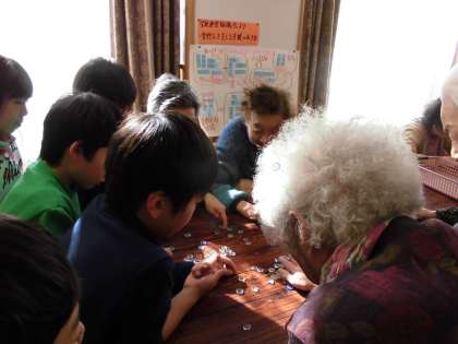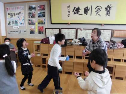 すこやか学級で、1年生が女性会の方から昔遊びを教えていただいたり、一緒に遊んだりしました。