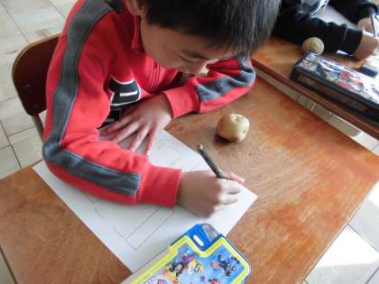 1年生は、家から持ってきたジャガイモに名前を付けたり、特徴を見つけたりすることを通して、互いを大切にしようとする気持ちが持てるような学習をしました。