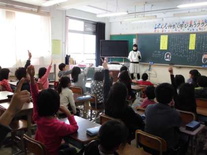 4年生は、韓国からのゲストティーチャーであるソン・ジョンさんを招いて、韓国の文化や衣・食・住、さらにはハングルを教えていただきました。