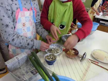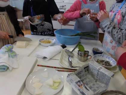 栄養教諭の山下先生から、最初に、作る手順や包丁の使い方や切り方を教えていただきました。