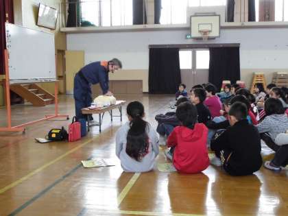 5年生が,お隣の楽只小学校の5年生とともに「子ども救急救命法」の実習を受けました。