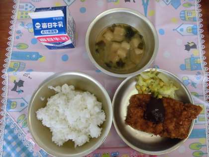 今日は、「卒業おめでとう」の行事献立、とんかつとソテーとみそ汁の日です。