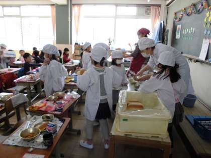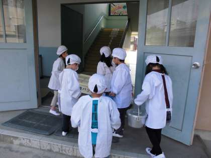 いよいよ給食が始まります。みんなとても楽しみにしています。当番も頑張っています。