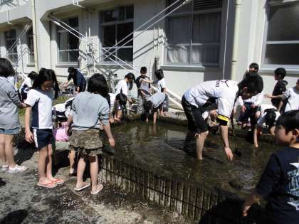 総合の学習で,5年生はお米を育てます。今日は,みんな裸足になって土を踏み,田んぼの準備をしました。おいしいお米がとれるのを楽しみにしています!!