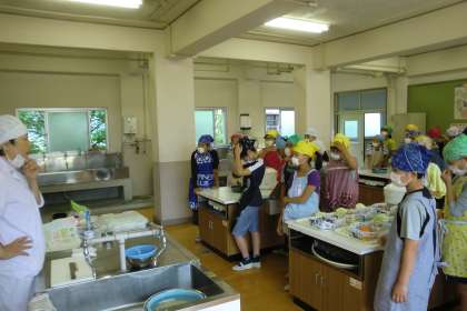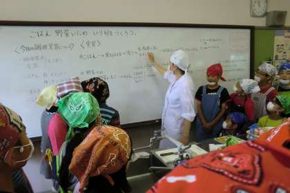 今日の調理のメニューは「いりたまご」と「野菜いため」です。最初に子どもたちは実習の流れを確認しています。