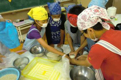 また,今日の調理実習では5年生の総合的な学習で育てたお米も使いました。1年かけて丹精込めて育てたお米です。子どもたちはジャーに分けて洗いました。