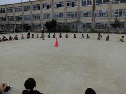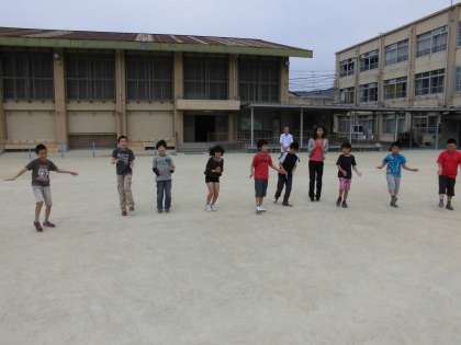 全員が盛り上がってきたところで,二時間目はキャンプファイアーでのダンス,歌の練習です。山の家では,一緒にキャンプファイヤーを行います。ダンスでは,マイム・マイム,オクラホマミキサーを,歌は「遠き山に日は落ちて」などを練習しました。両校とも四年生でのみさきの家で活動したこともあり,軽快に踊り,歌うことができました。