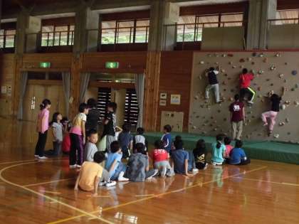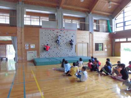 3日目の夕方、百井から帰ってきてボルダリングに挑戦しました。高い崖をルールに沿って登るスポーツです。全員ゴールすることができました。そして夜は楽しみにしていたキャンプファイアーを行いました。楽只小学校の友達とも合同で大いに盛り上がりました。
