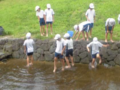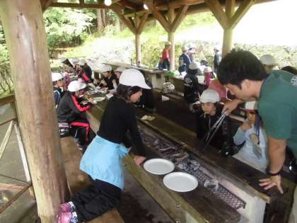 最終日、魚つかみを行いました。つかまえた魚は自分たちでさばき、炭火で焼いて食べました。命をいただくことの意味を考えながらの活動でした。午後からはこの山の家での学びをふりかえります。