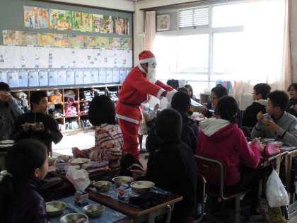 給食時間に,紫野小学校にサンタがやってきました。すずの音と共に,サンタさんとトナカイさんが教室に入ってくると 子ども達は初めはびっくりしていましたが,みんな笑顔いっぱい,大喜びでした。サンタさんから素敵なプレゼントをいただきました。