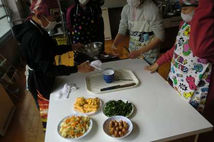 調理は意外と難しいものです。国語や算数などとは違った力が必要とされます。普段家でもお手伝いをしている人の手さばきは見事なものです。特に炒め物では火を上手に使いながら,おいしく仕上げていました。もちろん調理が苦手な子どもたちも,手が空けば積極的に何をしたらいいか探し,洗い物やもりつけを進めていくことができました。